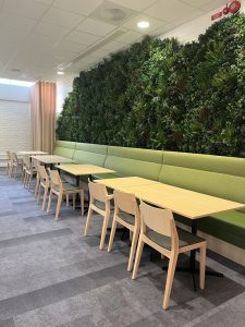 Miljön upplevs idag som betydligt lugnare och mer trivsam. Personalen rapporterar förbättrad arbetsmiljö och både besökare och patienter uppskattar den nya atmosfären. Växtväggen har blivit ett blickfång som lyfter hela matsalen och skapar ett välkomnande helhetsintryck.
